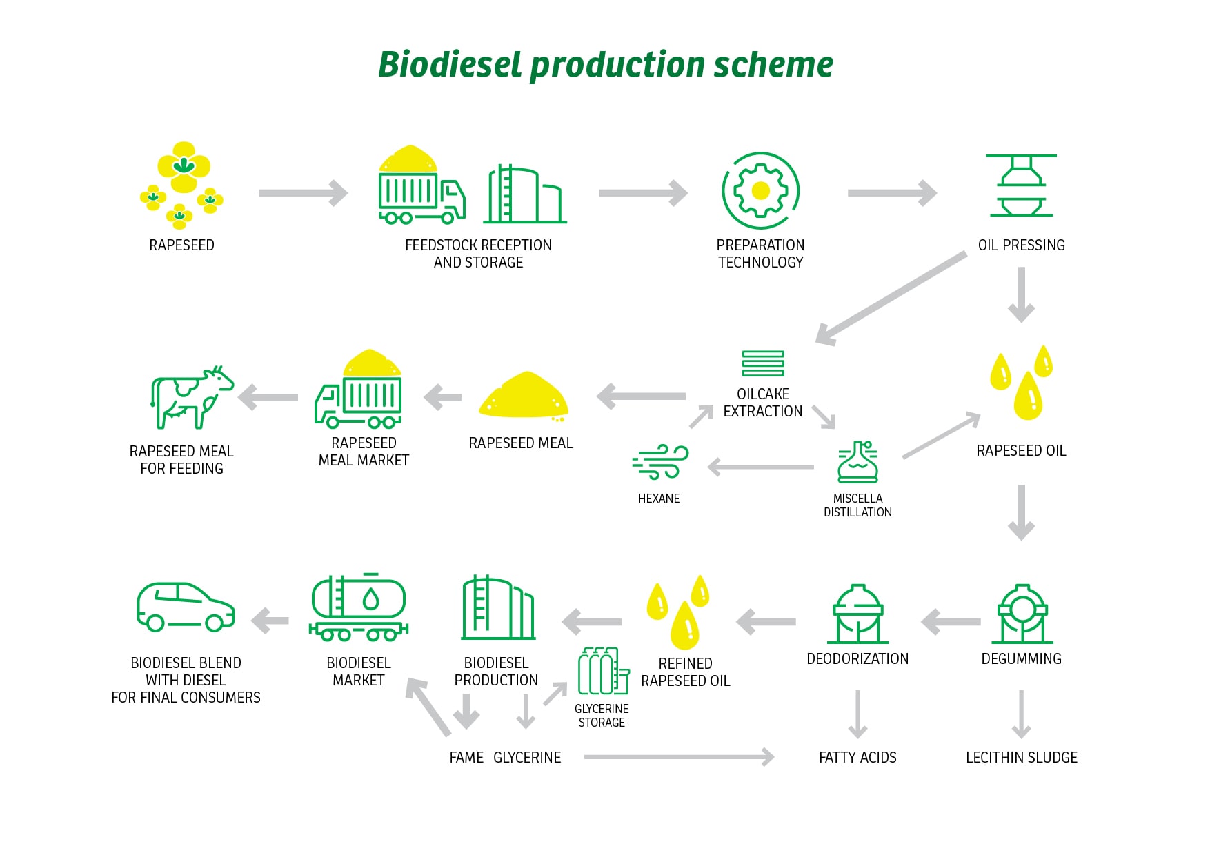Only a small part of the rapeseed plant is used for biodiesel production. After oil pressing, more than 50% of the processed mass remains in the form of rapeseed meal (with a high protein content – up to 35%). This locally produced feed (suitable for all livestock thanks to the balanced ratio of nutrients) can effectively replace imported (mostly GMO) soybean meal. Although this is almost unknown to the public, in this way biofuel production contributes significantly to the EU's protein self-sufficiency. At the same time, currently there is important research underway to evaluate the use of proteins of rapeseed origin even in human nutrition.